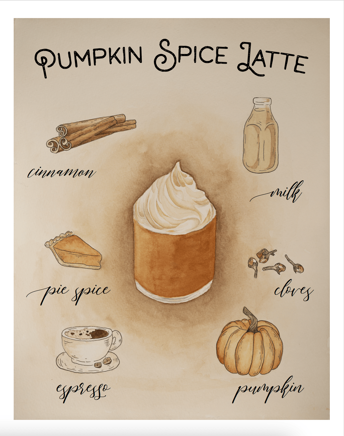 For the lover of lattes! This 11x14 print shows the ingredients for the fall favorite; Pumpkin Spice Latte.